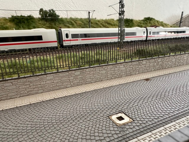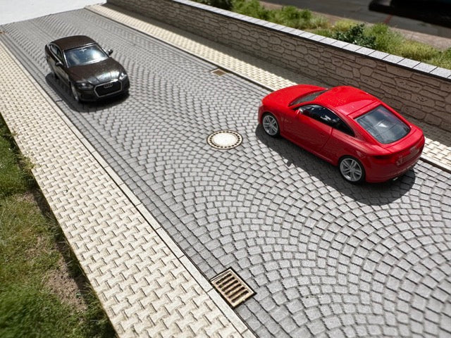 Pflastersteinstraße mit Gehwegen Gullis und Mauer - Minidiorama 1:87